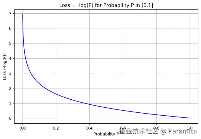 我们用 负对数似然(Negative Log-Likelihood, NLL) 来衡量预测的好坏,即对真实标签对应的概率 取负对数,它将原本在 区间内的概率值 映射到了 的范围: