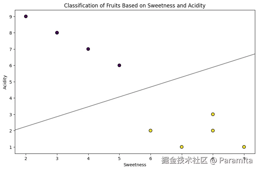 于是我们可以把这些水果表示为二维空间中的点(甜度,酸度),并尝试在图中画一条“分界线”,把这两类水果区分开: