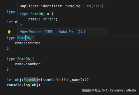 name2:number //接口SomeObj会被拓展name2属性,是一个merge的过程,如果property重名则会报错