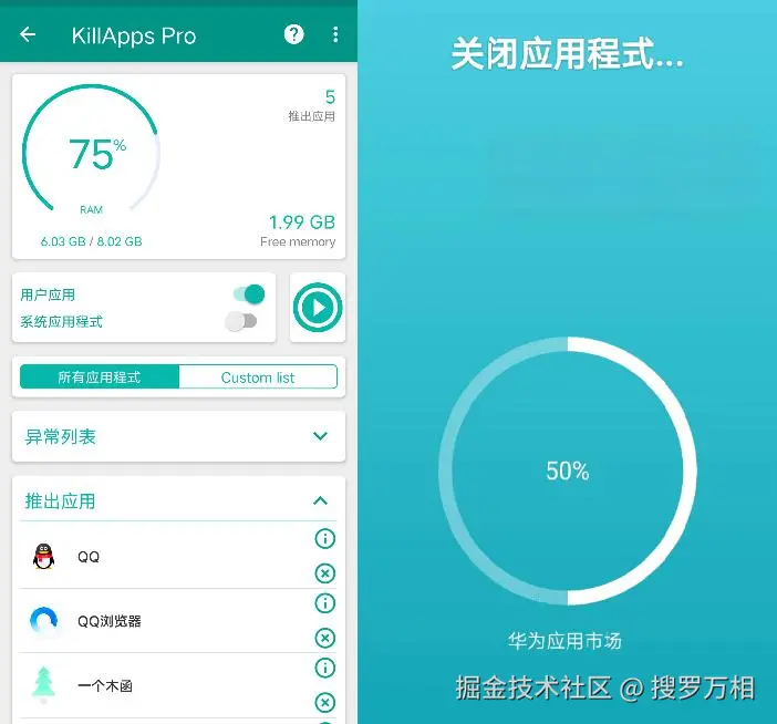 KillApps能快速关闭所有正在运行的应用,防止应用程序在被杀后重新启动,加速器、RAM清洁器、节电器、CPU散热器、任务杀手