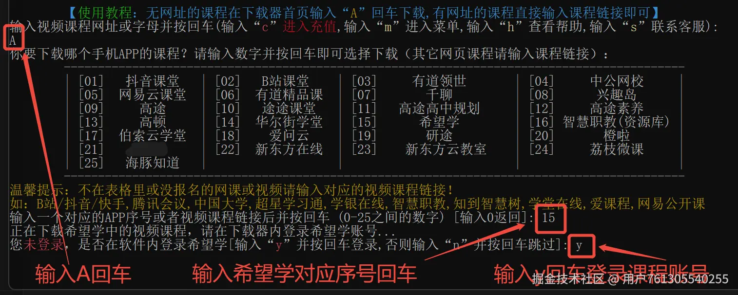 【详细教程】如何下载希望学上面已购买的视频课程 用户761305540255 2025-07-11 198 阅读1分钟 前言:很多同学都想知道希望学视频课程怎么下载,但是希望学上面已购买的视频课程是不提供直接下载方式的,所以下面就教大家如何下载希望学上面已购买的视频课程。 一、下载器首页输入A回车,再输入希望学对应序号并按回车,提示登录,再输入Y登录对应的希望学账号 二、此时会有弹窗让你登录,选择对应登录方式登录希望学账号即可 三、登录后会出现已购买的课程列表,找到要下载的课程,输入对应序号并回车 四、然后会提示输入下载选项,直接回车即可,可以批量自动下载视频文件 五、下载好后的文件可在本地路径下的Download目录中找到,可用播放器打开 六、学无止下载器获取地址 www.xuewuzhi.cn/xiwang_down…