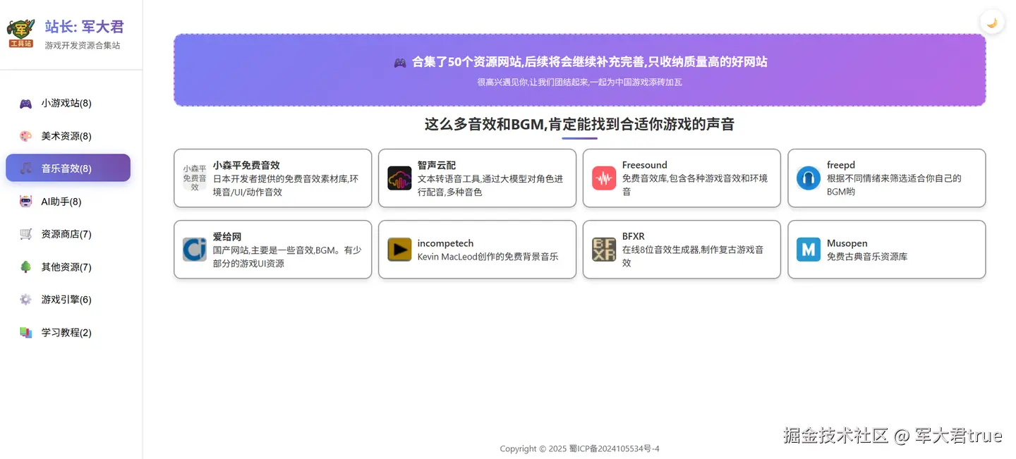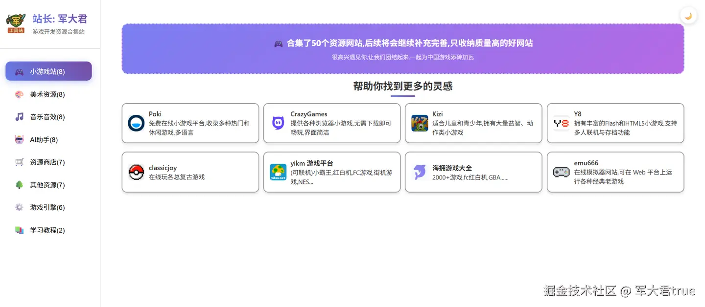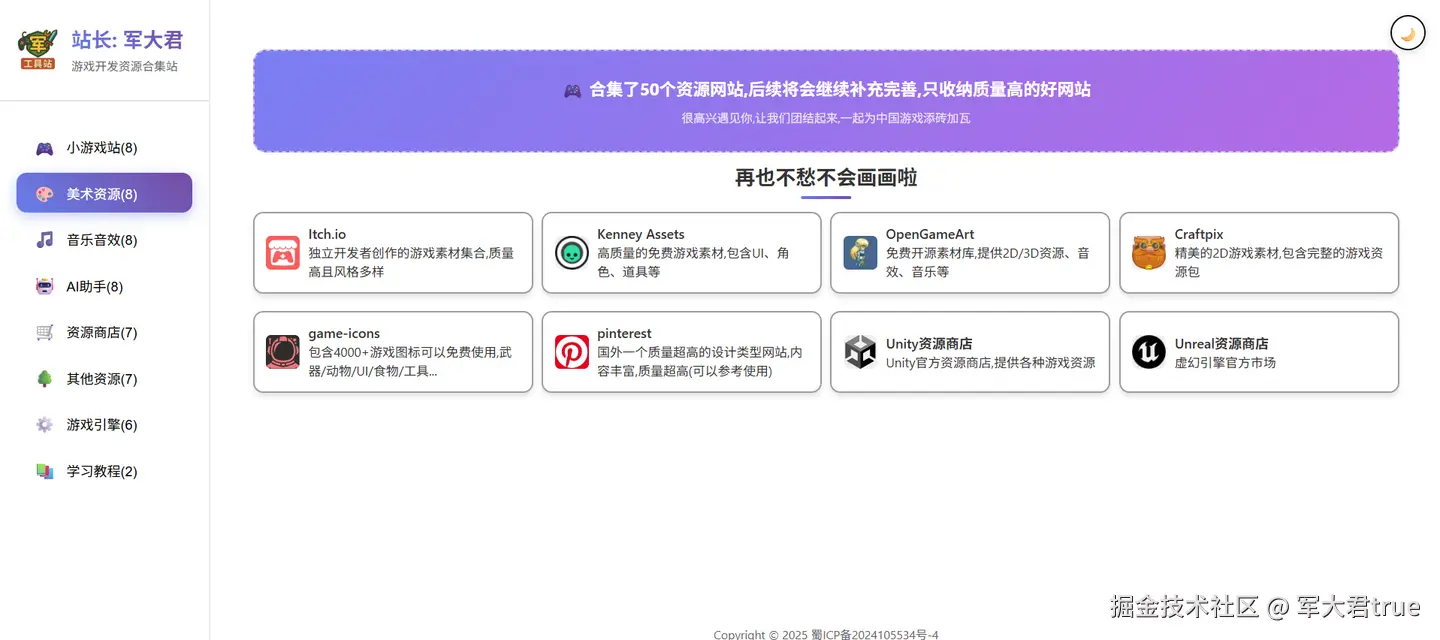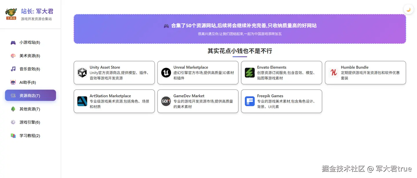 目前里面包含了,游戏美术资源,游戏音乐音效资源,AI助手网站,游戏资源商店,游戏引擎,游戏学习教程。后续可能考虑加入字体资源。网站还有白天和夜晚2个主题,晚上使用更加的护眼。