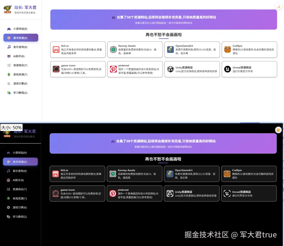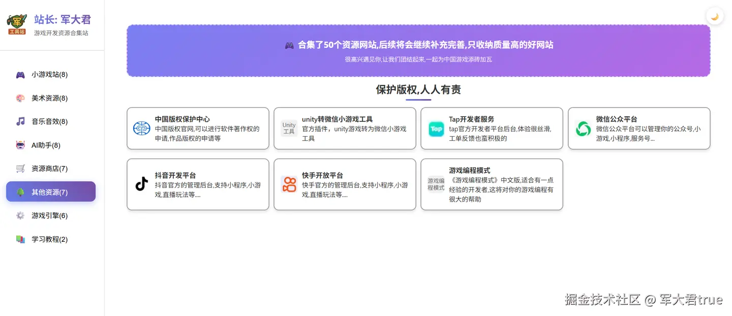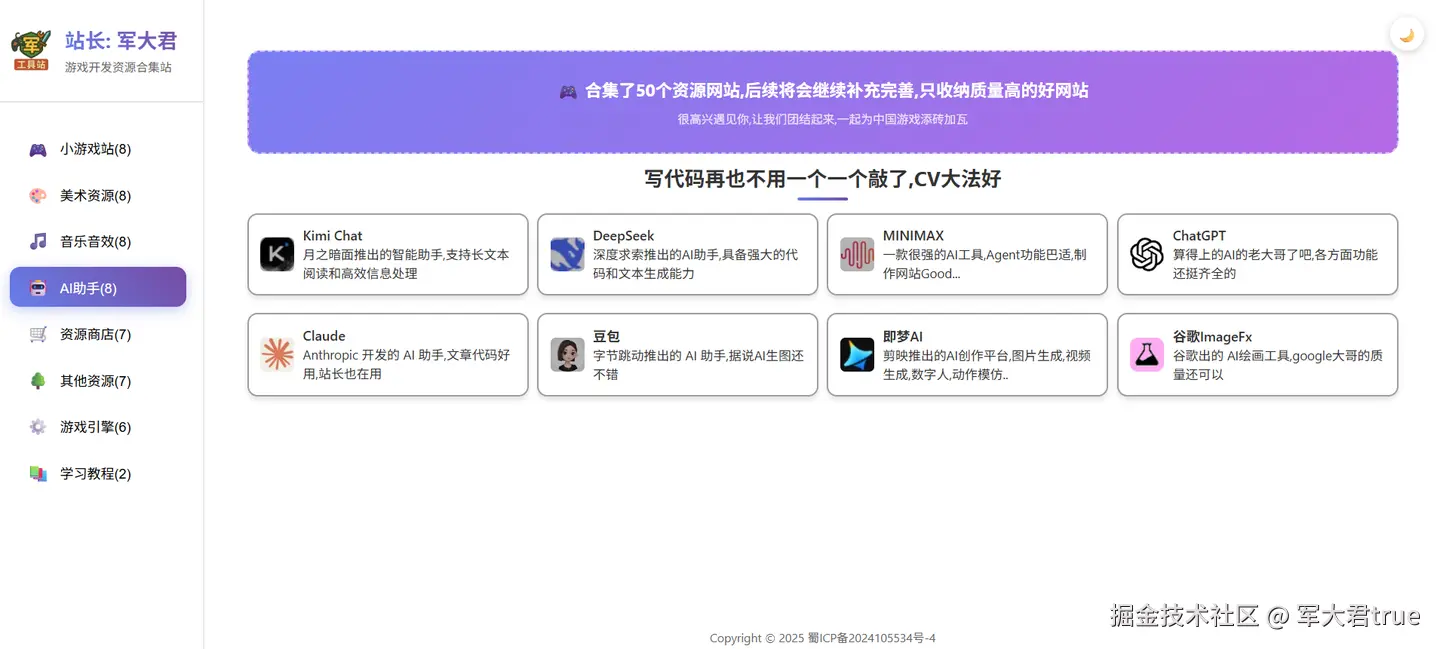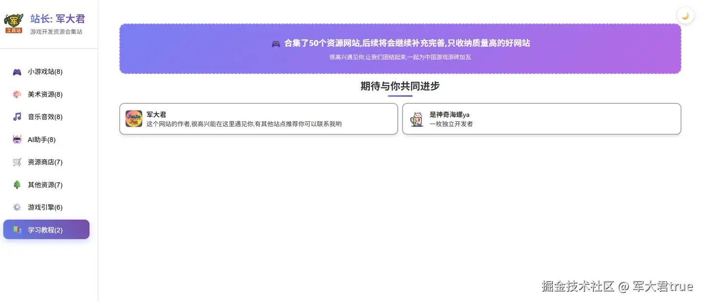 目前里面包含了,游戏美术资源,游戏音乐音效资源,AI助手网站,游戏资源商店,游戏引擎,游戏学习教程。后续可能考虑加入字体资源。网站还有白天和夜晚2个主题,晚上使用更加的护眼。