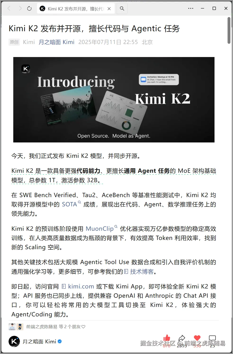 朋友们,这绝对是目前 AI 界最炸裂的新闻,Kimi 于2025年7月11日的晚上 22 点55分发布文章,宣布 k2 模型已正式可用,全面上线。