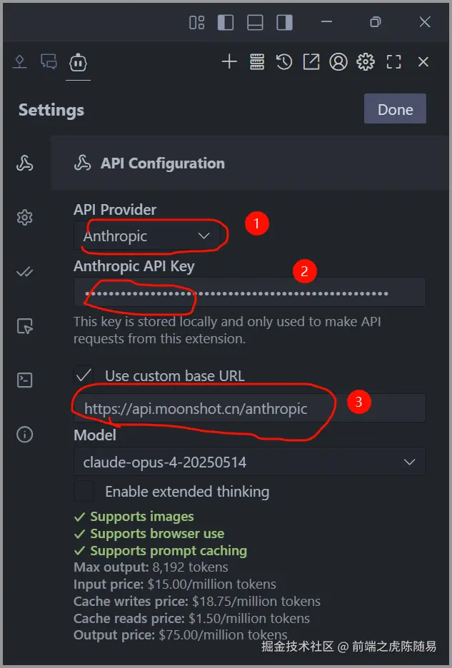 接下来,在 Cline 扩展里面,点击右上角的配置按钮,按照图中的 1-2-3 填好对应的内容,自定义 URL 地址为 https://api.moonshot.cn/anthropic。