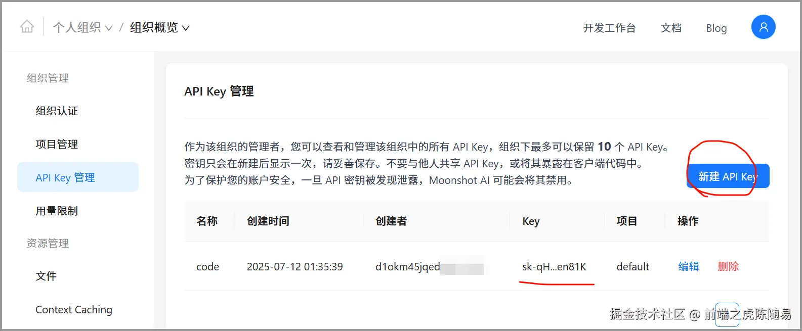 首先,你得到 kimi 的开放平台 https://platform.moonshot.cn 创建一个 key。