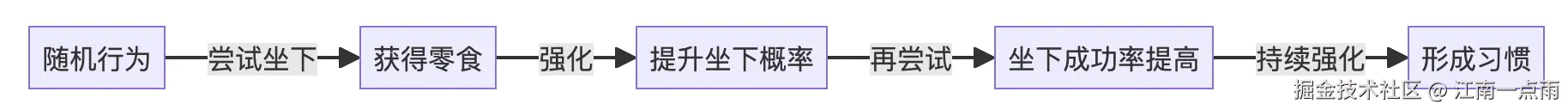 - 小狗听到"坐下"指令后随机尝试各种行为(坐下、站立、趴下等)