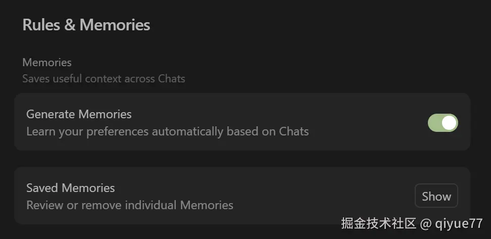 - 启用 Memories 后,Cursor 会自动记录对话、操作、重要上下文