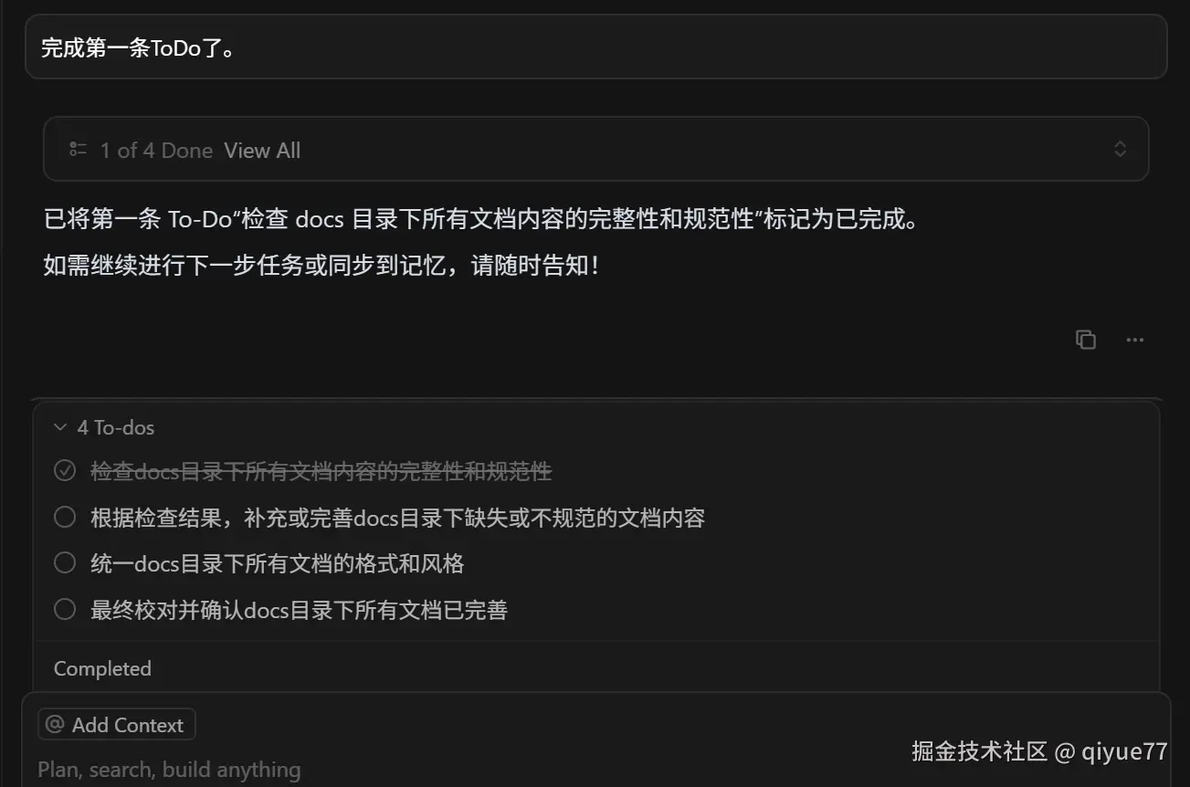 - 通过明确要求记住ToDo,添加上下文,打开新的chat也能直接知道ToDo。