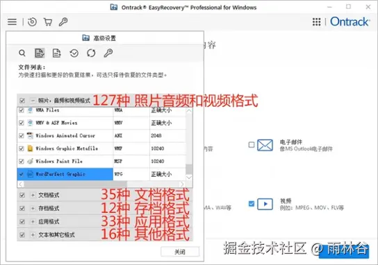 在 EasyRecovery 的文件列表中,研发团队为用户预置了 223 种文件签名,包含 123 种多媒体格式、35 种文档格式、12 种存档格式、33 种应用格式以及 16 种其他格式,覆盖了大多数常见文件签名。