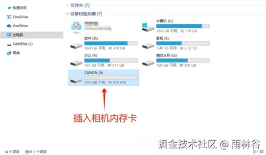 请先把内存卡插入读卡器中,再将读卡器连接到电脑。如下图所示,此时相机内存卡中的数据已经完全丢失。