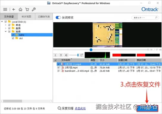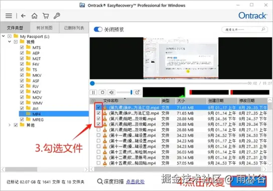 在文件类型列表中,点击“MP4”格式,勾选需要恢复的视频,点击“恢复”按钮即可将文件提取出来。