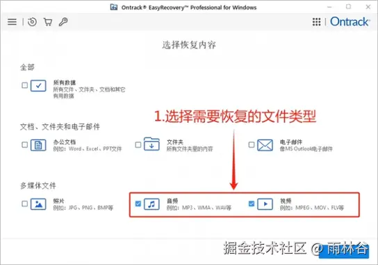 打开 EasyRecovery 数据恢复软件,选择需要恢复的内容为“音频”和“视频”。
