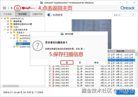 点击左上角按钮,返回 EasyRecovery 主页。软件弹出窗口询问,是否要保存扫描信息,点击“是”将本次扫描结果保存,以便日后进行快速恢复。