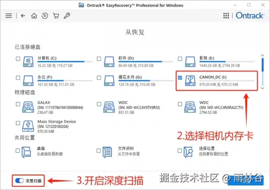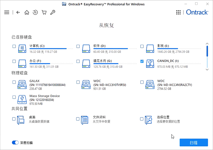在“已连接设备”列表中,勾选相机内存卡盘符,开启 “深度扫描” 模式后,点击右下角的“扫描”按钮。