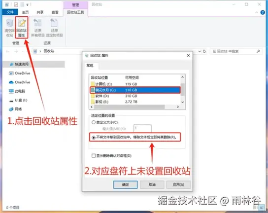打开回收站后,点击左上角的“回收站属性”按钮,查看各盘符中的回收站配置情况。也就是说,回收站中的文件会保存在对应盘符的回收站空间内。如果该分区上没有设置回收站空间,按 Delete 键删除的文件将被彻底抹除。