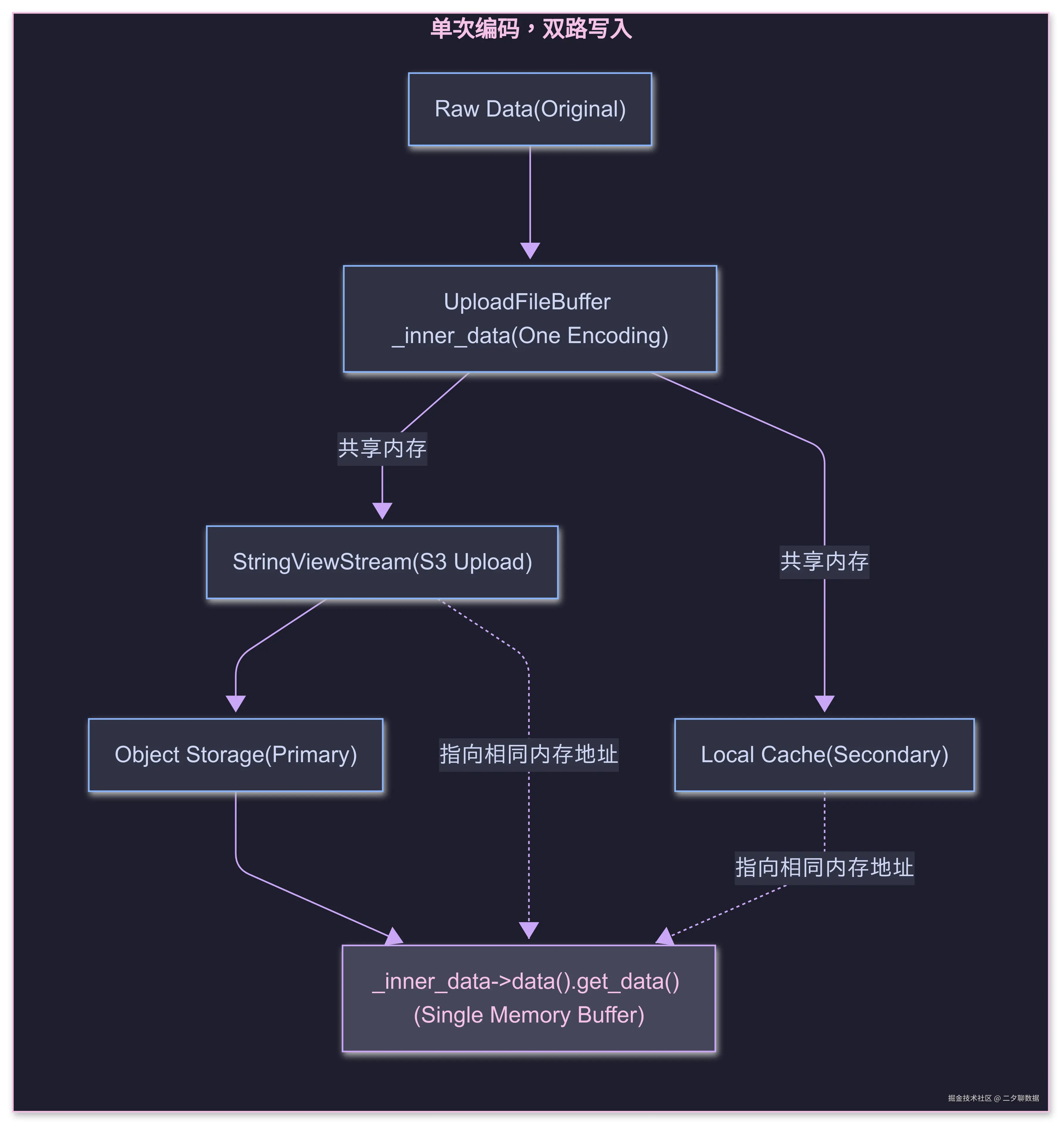 这种设计带来了显著的性能优化,这一设计通过内存共享避免了数据拷贝,对象存储上传和缓存写入都直接引用同一块内存,大幅提升了处理效率。数据只在首次写入 UploadFileBuffer 时进行一次编码,后续所有操作都复用这份编码后的数据,减少了重复计算。这种统一数据来源的设计既保证了数据一致性,又通过内存共享和零拷贝机制最大化了性能,无需额外的编码或解码操作,为高吞吐量的数据写入提供了有力支持。
