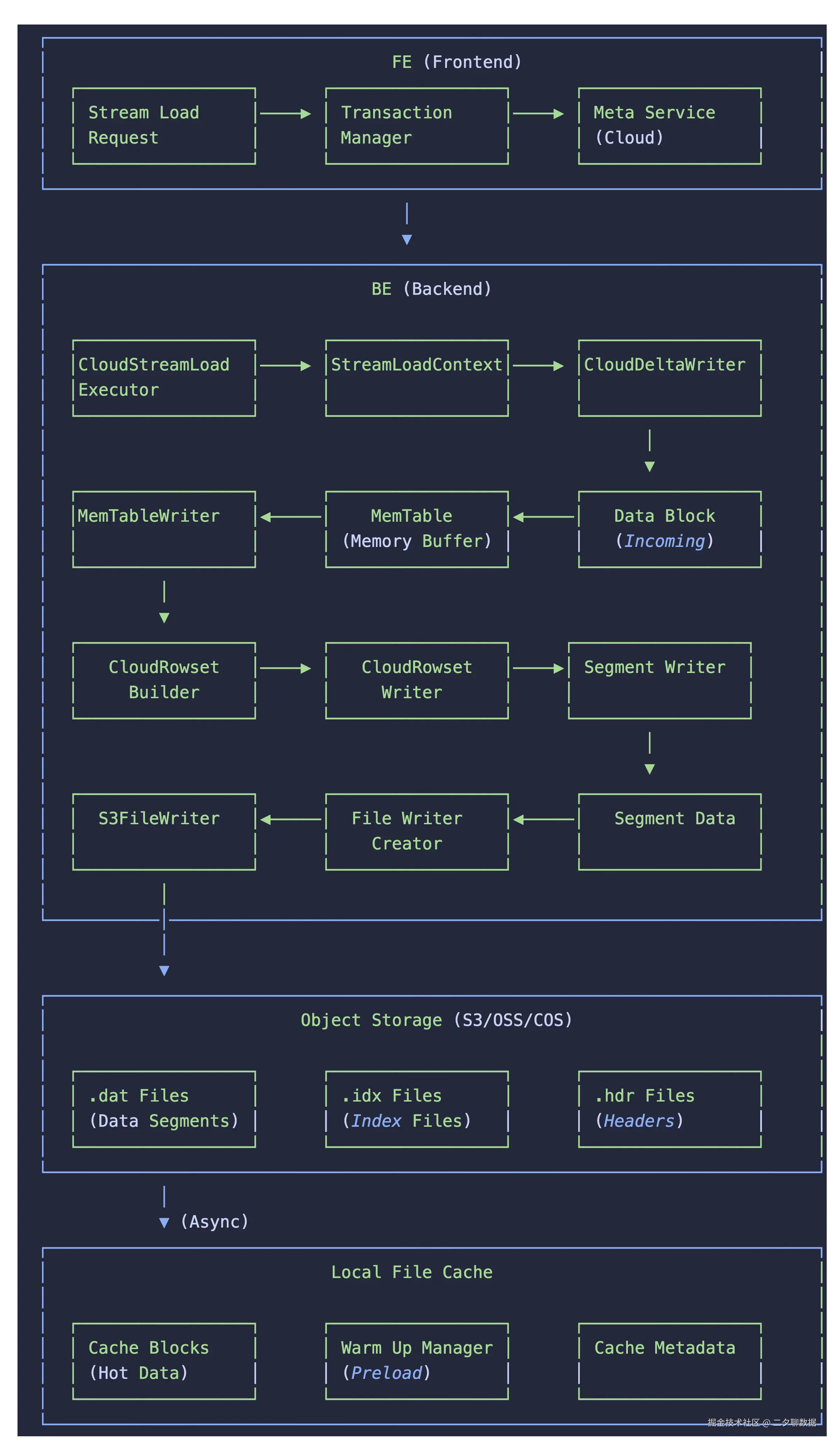 综合源码分析可见,Doris 存算分离模式采用了高效的编码和写入策略:数据仅需一次编码就写入 UploadFileBuffer 的 _inner_data 内存缓冲区;对象存储写入通过 StringViewStream 零拷贝引用内存缓冲区;本地缓存写入则通过 Slice 机制直接引用相同的内存区域。