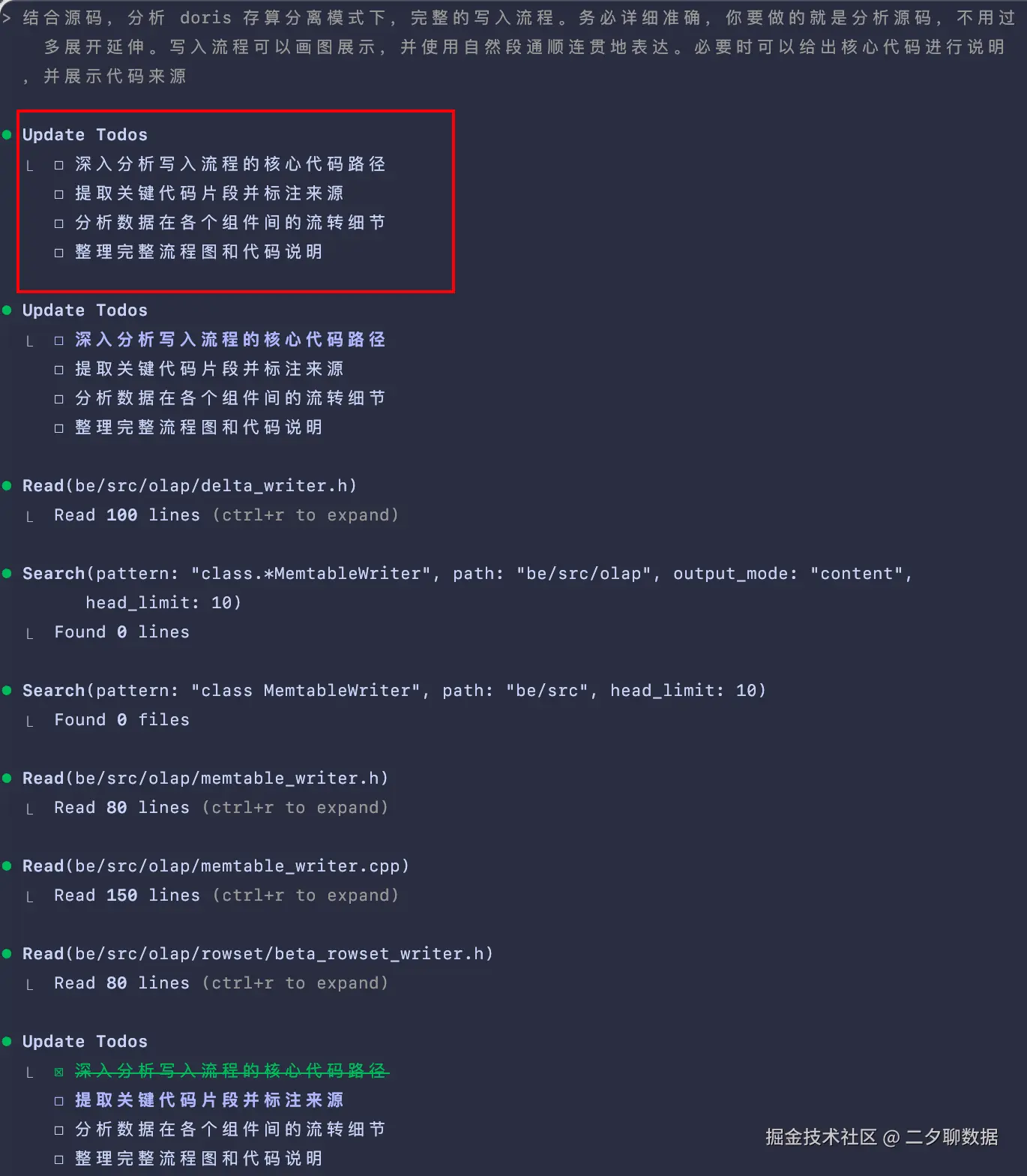 会发现 Claude Code 会把输入的“人话”解析为 TODOS,进行逐步执行,可以很直观的看见拆分的任务是否合理。
