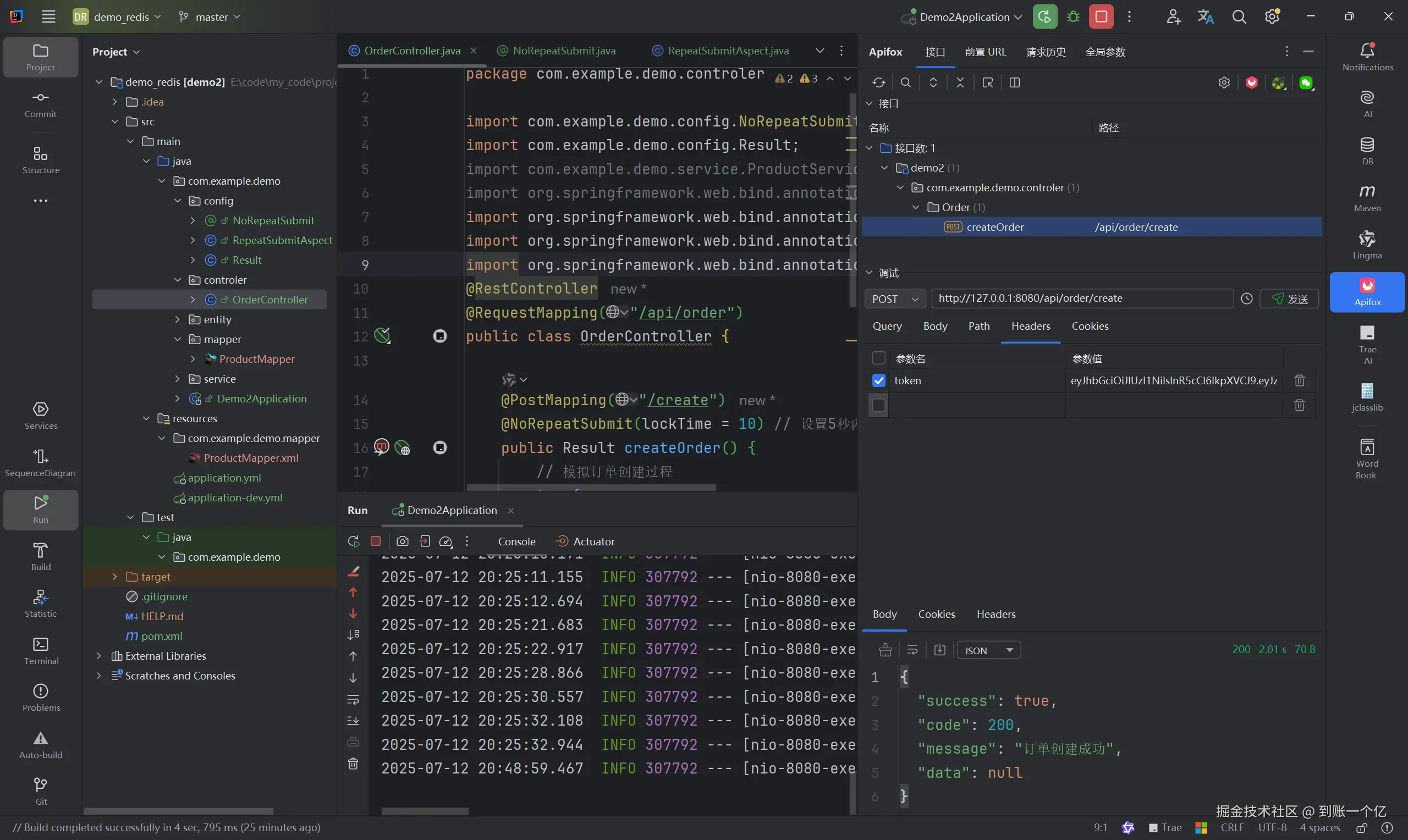 通过 AOP 拦截 @NoRepeatSubmit 注解的方法,使用 Redisson 操作 Redis 实现限流逻辑: