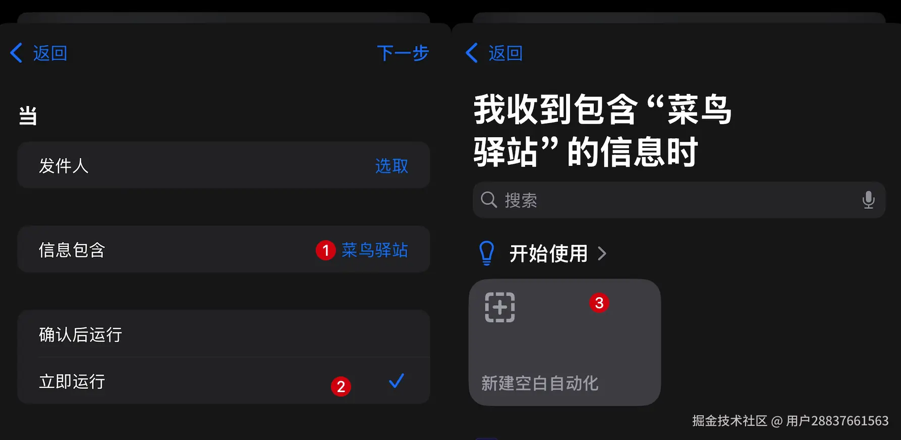 3、手动执行一次并授权,快捷指令在第一次运行时需要做一些授权。所以最后手动触发一次,完成授权。可以用其他人的手机,向自己的手机发送一条符合条件的短信,来测试触发。