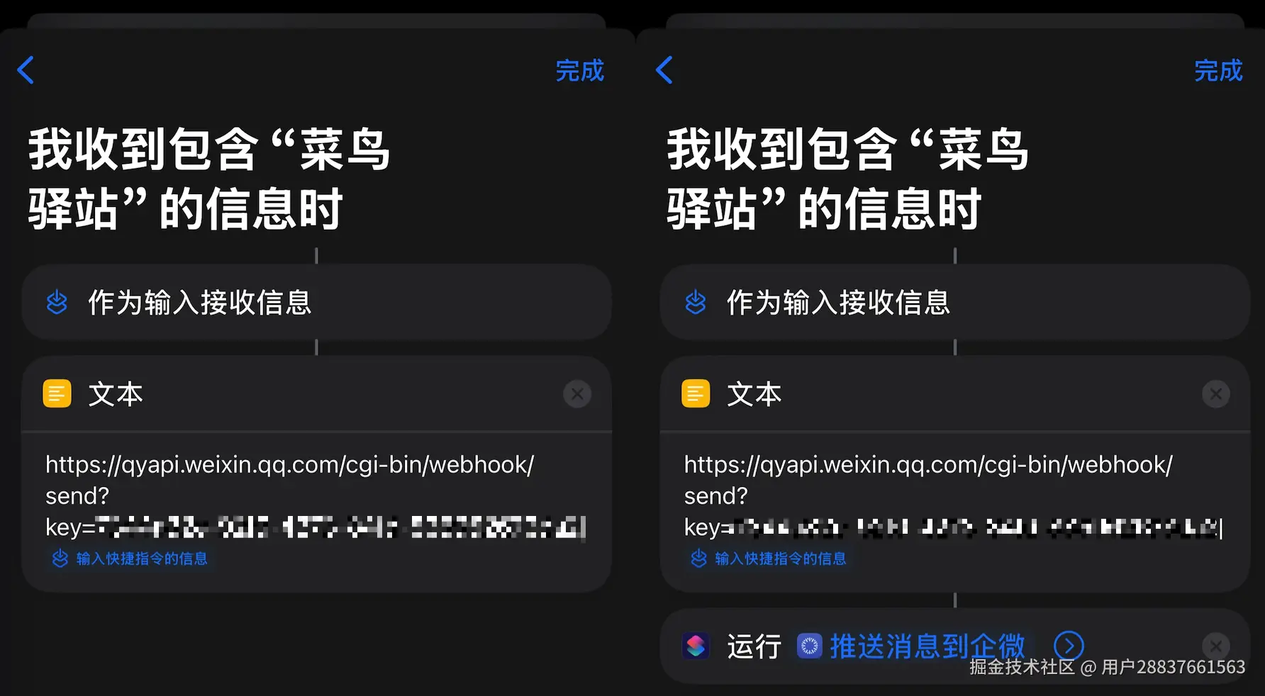 1、创建一个「推送消息到企微」的快捷指令,这个快捷指令中的动作依次如下: