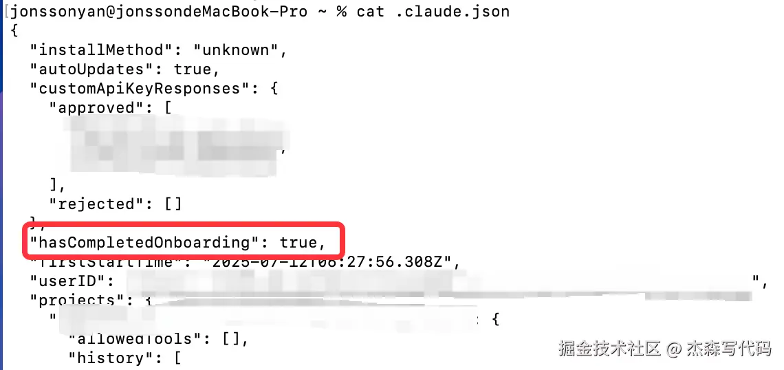 我们只需要编辑 $HOME/.claude.json 添加新字段"hasCompletedOnboarding": true即可