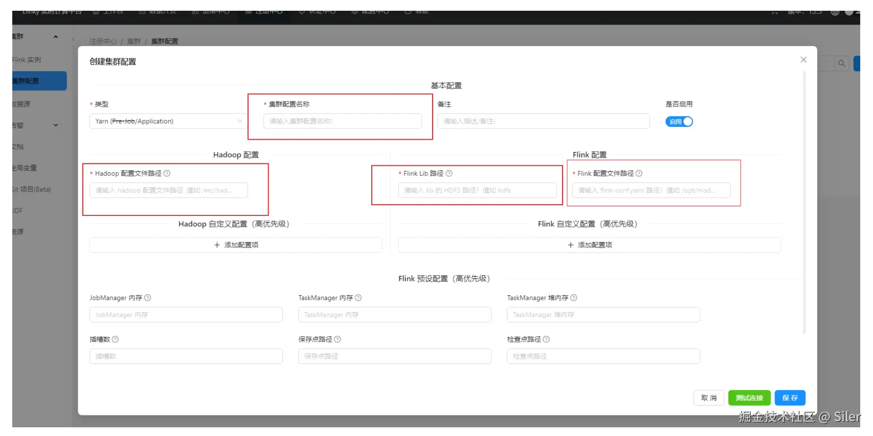 Flink Lib路径:提供Flink的资源包路径,数据开发的一个底层依赖环境,填写hdfs配置路径,之前安装步骤中有涉及这些文件的上传。