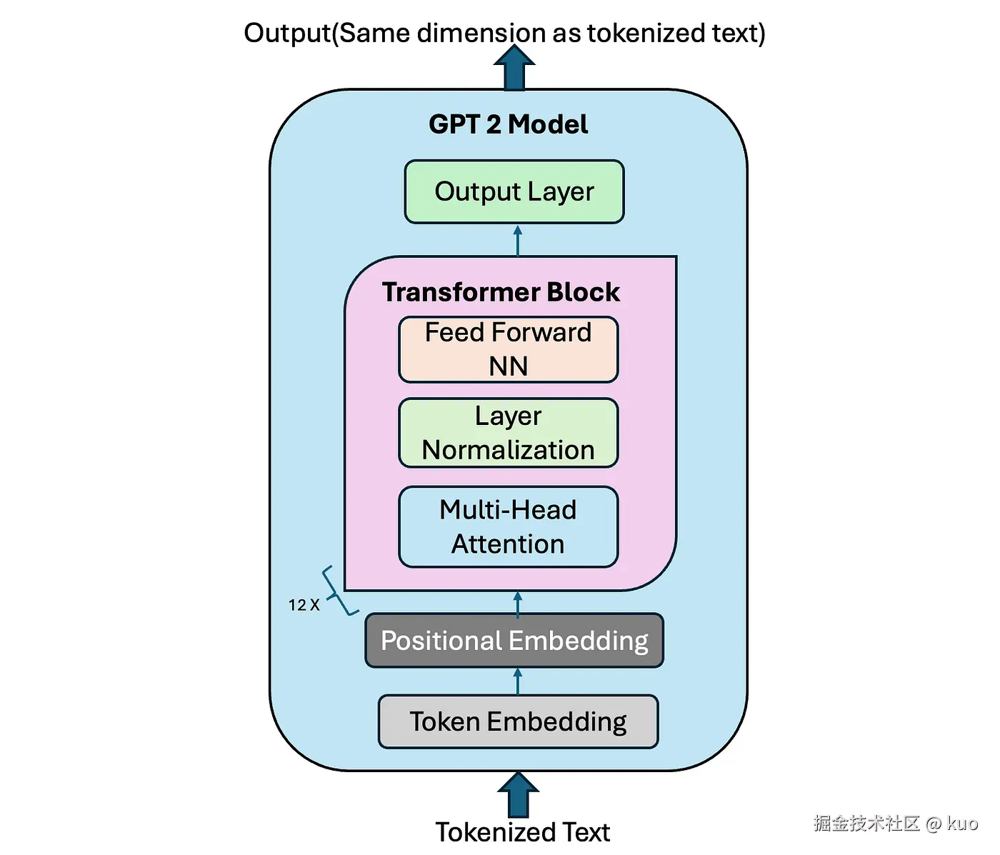 我们已经实现了Embedding和Multi-Head Attention,现在开始实现完整的gpt2。gpt2的整体架构如下图所示: