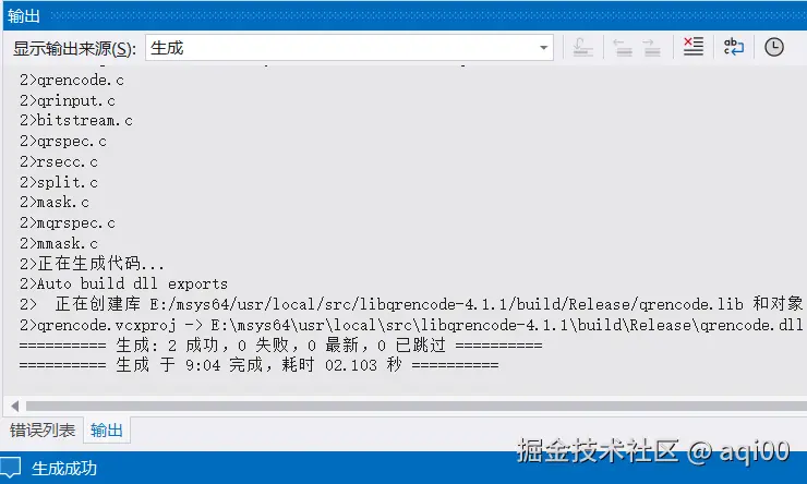 依次选择顶部菜单:生成→Build ALL_BUILD,Visual Studio就开始编译qrencode模块。编译过程可在Visual Studio界面下方观察,直到编译完成如下图所示。