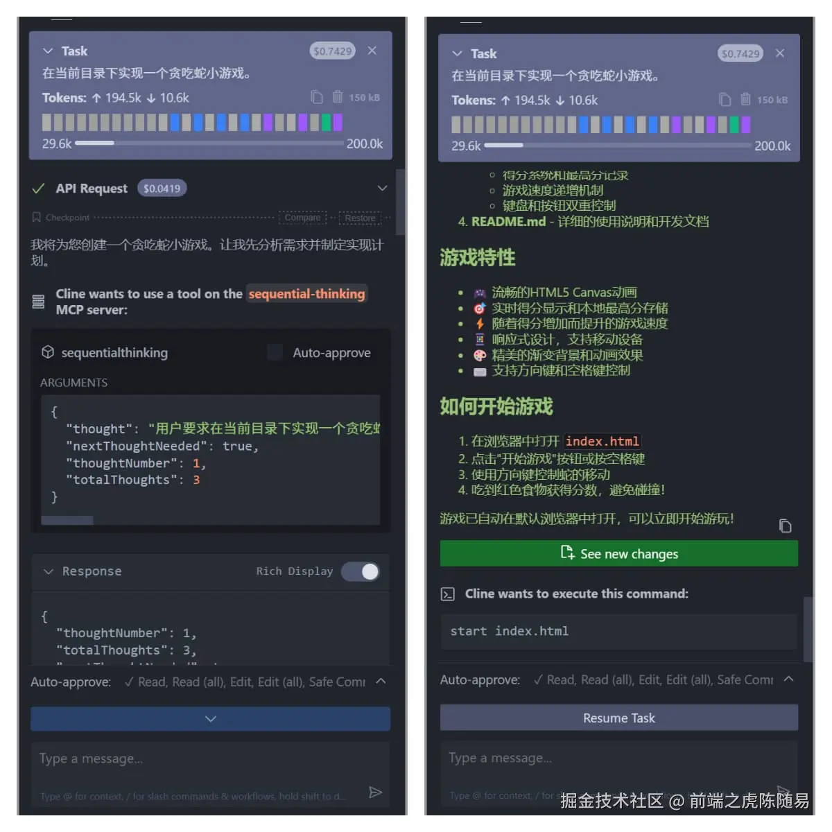 那么 sequential-thinking 和 context7,就是本文想要分享给各位的 AI 编程利器,在 Kimi k2 的加持下,通过 VSCode+Cline+Kimi k2+sequential-thinking+context7,我们就能实现性价比超高的 Cursor 体验克隆啦!