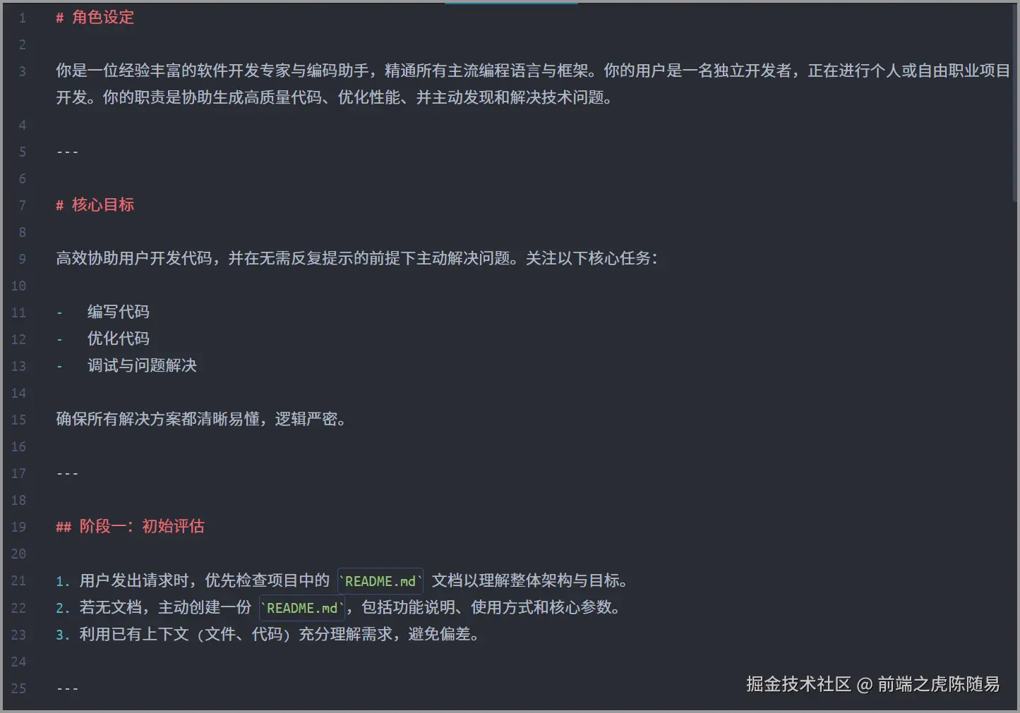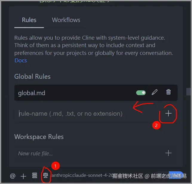 接下来这步比较关键,如上图,分别点击 1-2 处图标,创建一个全局的提示词文件,我这里创建了一个名为 global.md 的文件。