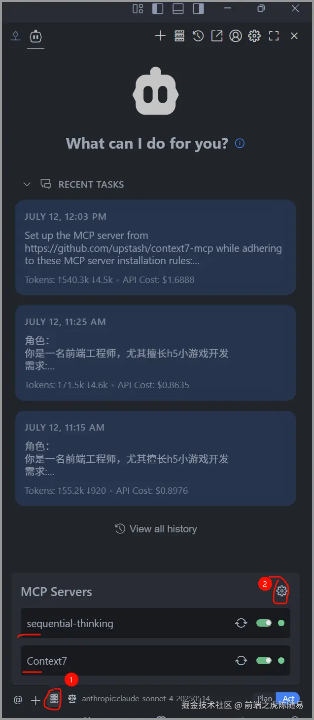 接下来呢,分别点击上图中 1-2 处图标,如图所示,sequential-thinking 和 Context7 就是我们要安装的 MCP 服务 (这是我已经安装好的效果,你没有安装是没有的),也是解决以上问题的关键。