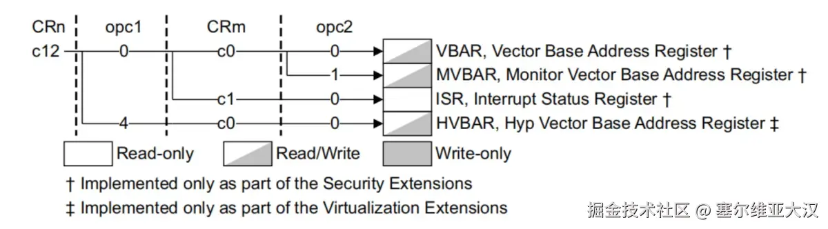 armv7 中对于协处理器的访问,CP15的寄存器只能被MRC和MCR(Move to Coprocessor from ARM Register )指令访问。MCR表示将 arm 核心寄存器中的值的写到 cp15 寄存器中,MRC 从 cp15 寄存器中读到 arm 核心寄存器中,大部分指令都需要在 PL1 以及更高的特权级下才能正常执行,这是因为 cp15 协处理器大多都涉及到系统和内存的设置,user 模式没有操作权限,user 模式仅能访问 cp15 中有限的几个寄存器比如:ISB、DSB、DMB、TPIDRURW、TPIDRURO 寄存器。