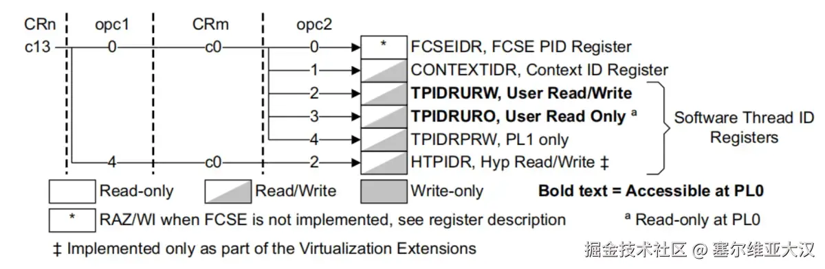 #define TPIDRPRW CP15_REG(c13, 0, c0, 4) /*! PL1 only Thread ID Register | 仅PL1线程ID寄存器*/