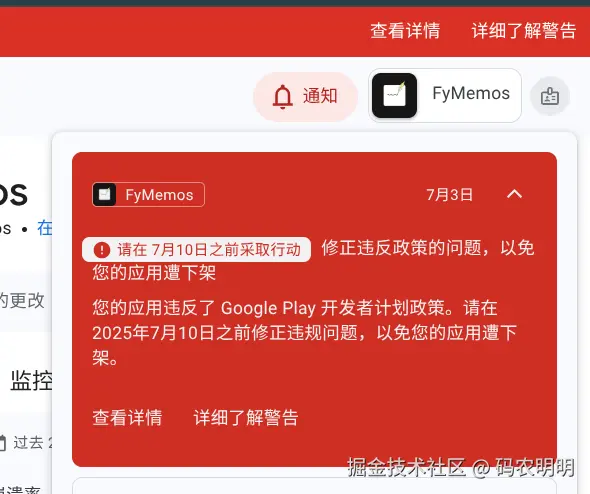 对于上架的应用,即使没有发布新版本,也有可能被抽查去审核,这时候如果遇到了问题,谷歌也会发信息来让你整改,因此需要关注后台和邮箱,遇到问题要在最终截止日之前修掉对应问题,否者真的会被下架。我就遇到了这个问题,我所提供的登录凭据,审核人员自己输入错误,把我填写的o输入成了0,导致他无法登录,就给我发了整改通知。不过我在修复之后,错误提醒过了仍然没有消失,对于这一点,如果你已经确保改过了就不用再担心了。以下是错误提醒,过了这么多天仍然还在显示。