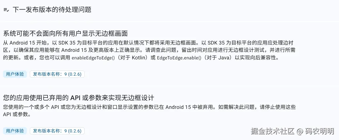 谷歌现在每年都要求应用升级Target 版本,这一点开发者也是需要去乖乖的做的,否者新应用无法上架,老应用无法更新。除此之外,对于Android的新特性开发者也应用去积极适配,对于一些特性,google play console也会提醒开发者去适配,比如下图所示。