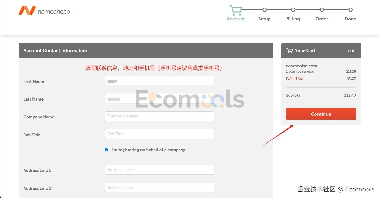 我们以注册一个新的账号为例,填写完这些必备信息后点击“Create Account and Continue”。进入到下一步,这里我们需要填写更多的联系信息: