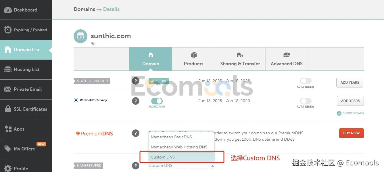 第三步: 我们以SiteGround主机为例,我们需要通常在域名注册商(如Namecheap)后台填写SiteGround的DNS服务器地址 ns1.siteground.net, ns2.siteground.net。