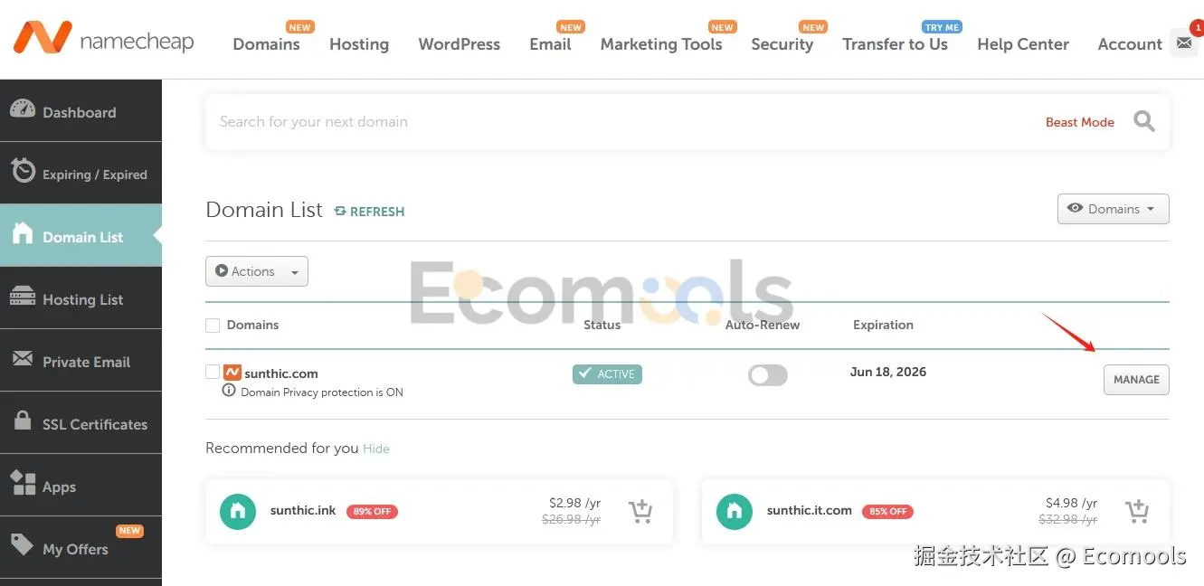 我们进入到Namecheap的后台,然后找到对应的域名,点击“Manage”。