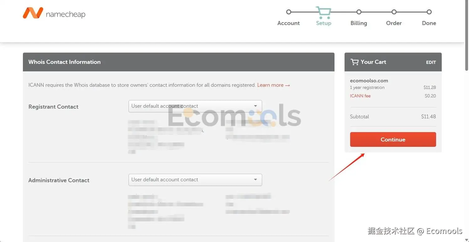 填完信息之后我们点击“Continue”。进入到Whois信息设置,保留默认选项即可,点击Continue。
