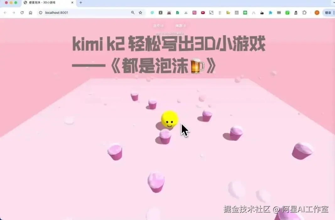 先让 kimi k2 给我们小试牛刀一下3D小游戏,看看他对3D渲染之类的场景熟悉不。