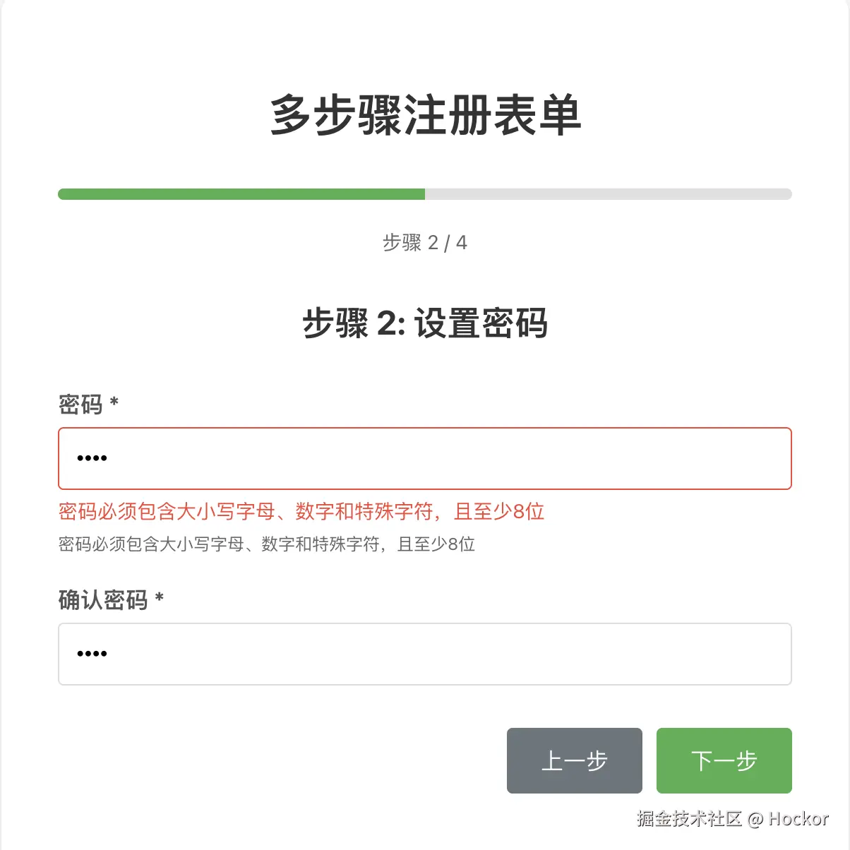 - 每一步都要有表单校验(比如密码复杂度、邮箱格式、手机号格式)