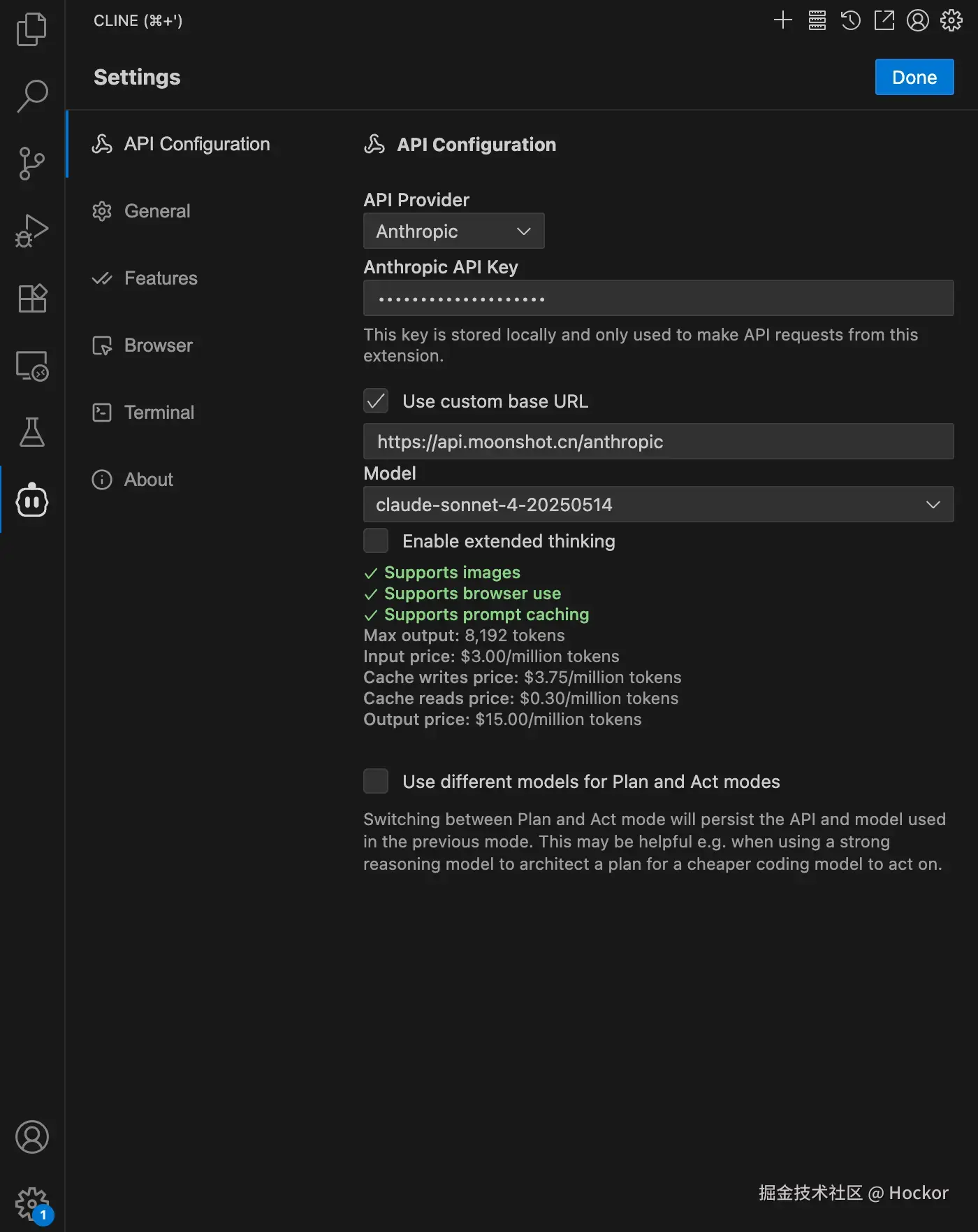 - Anthropic API Key 配置从 Kimi 开放平台获取的 Key