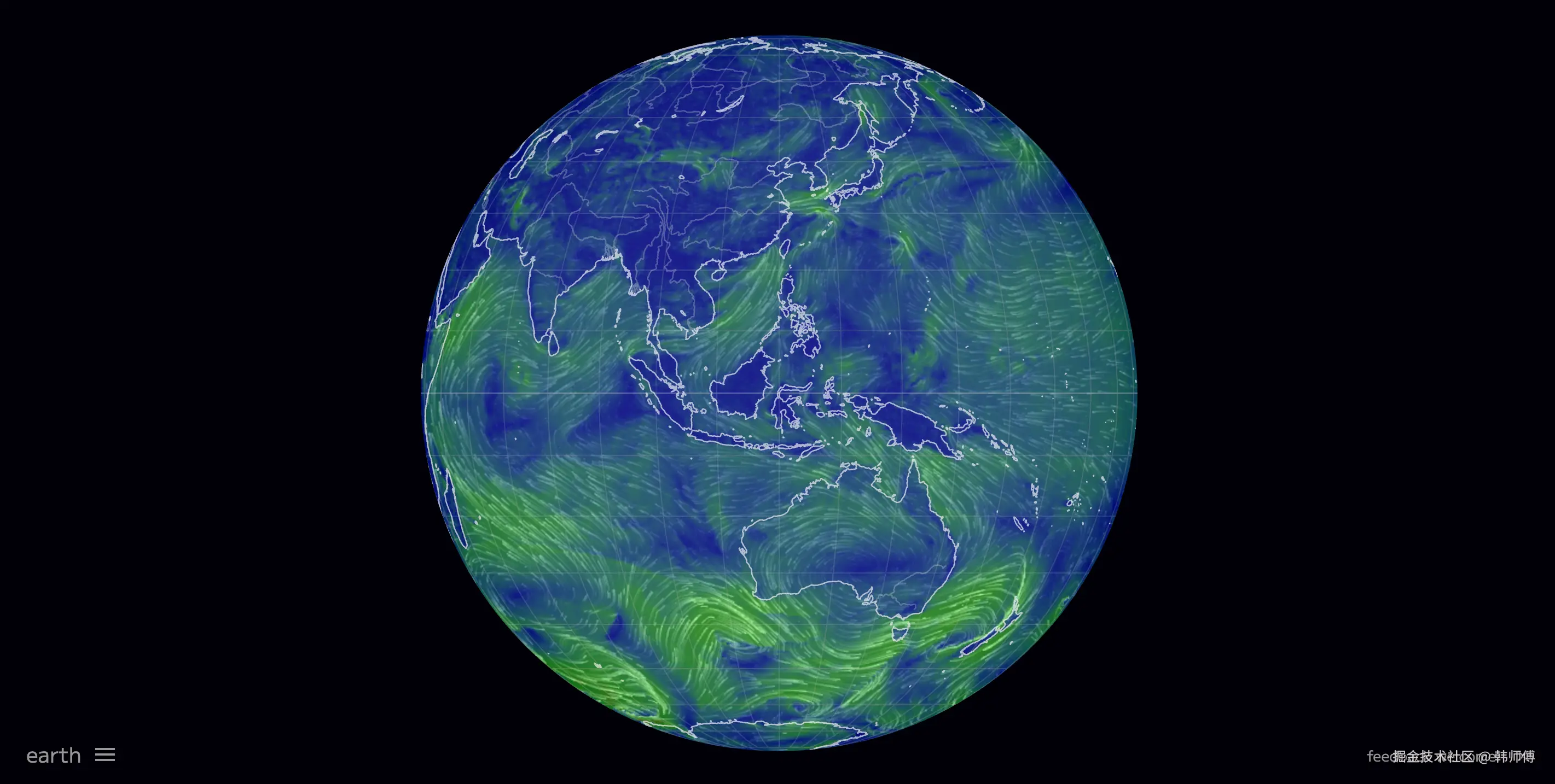 | 风场图(第一张) | 风向风速 | 多维向量场(u, v) | WebGL 粒子系统 + 贝塞尔曲线插值 | 需要高帧率刷新、实时动画,常用于气象可视化 |