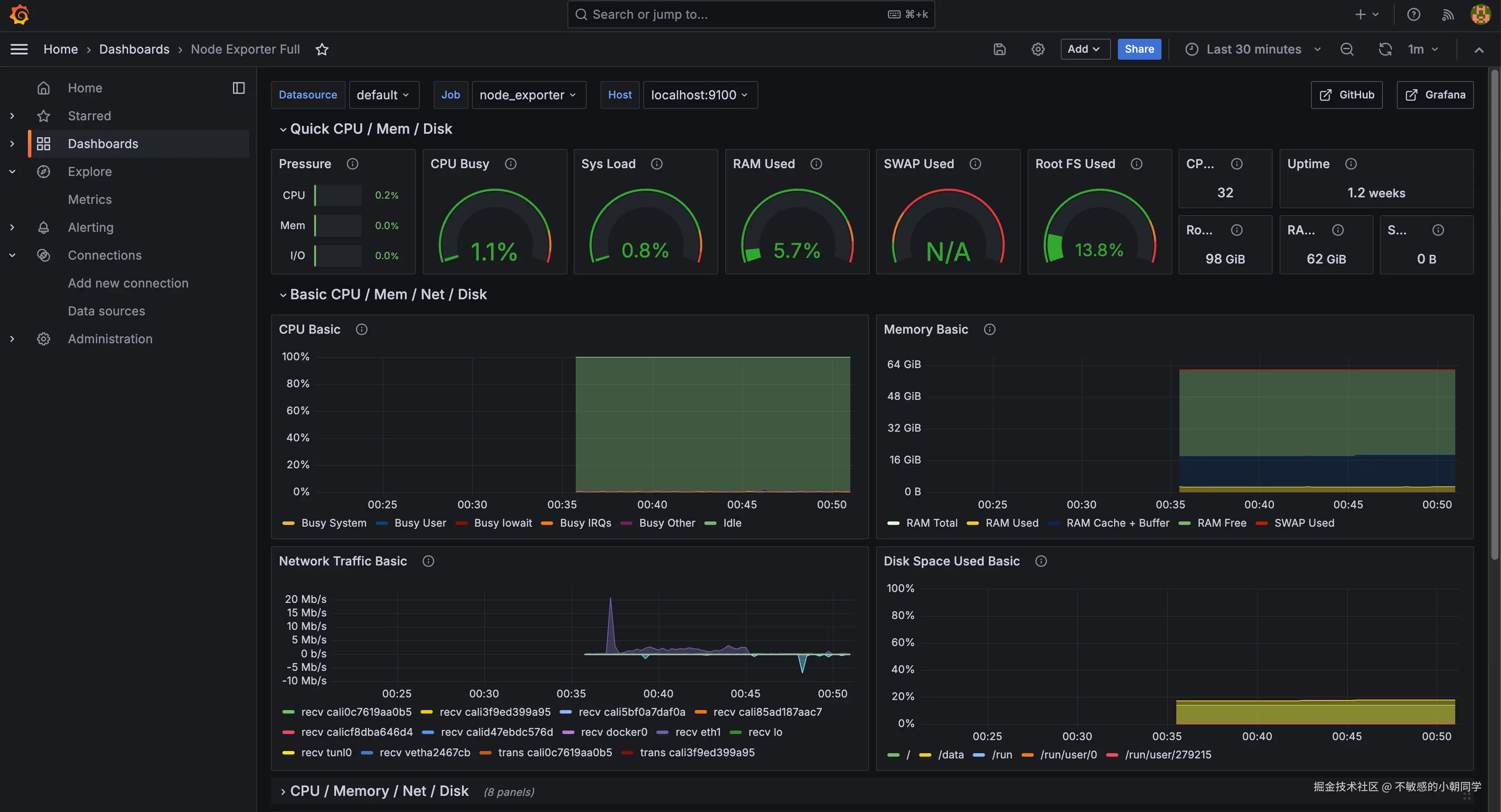 启动上面下载好的 grafana-server 之后,导入 node_exporter 的 dashboard 配置,即可获取如下所以的 dashboard 图形化展示