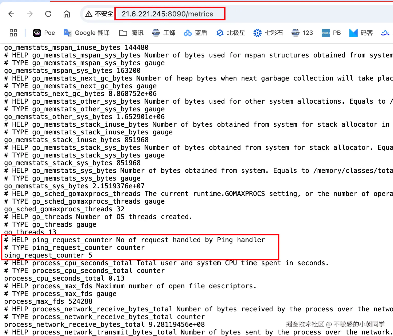 启动上述服务之后,我们访问对应的 /ping 接口就能在看到对应的 metrics 的指标