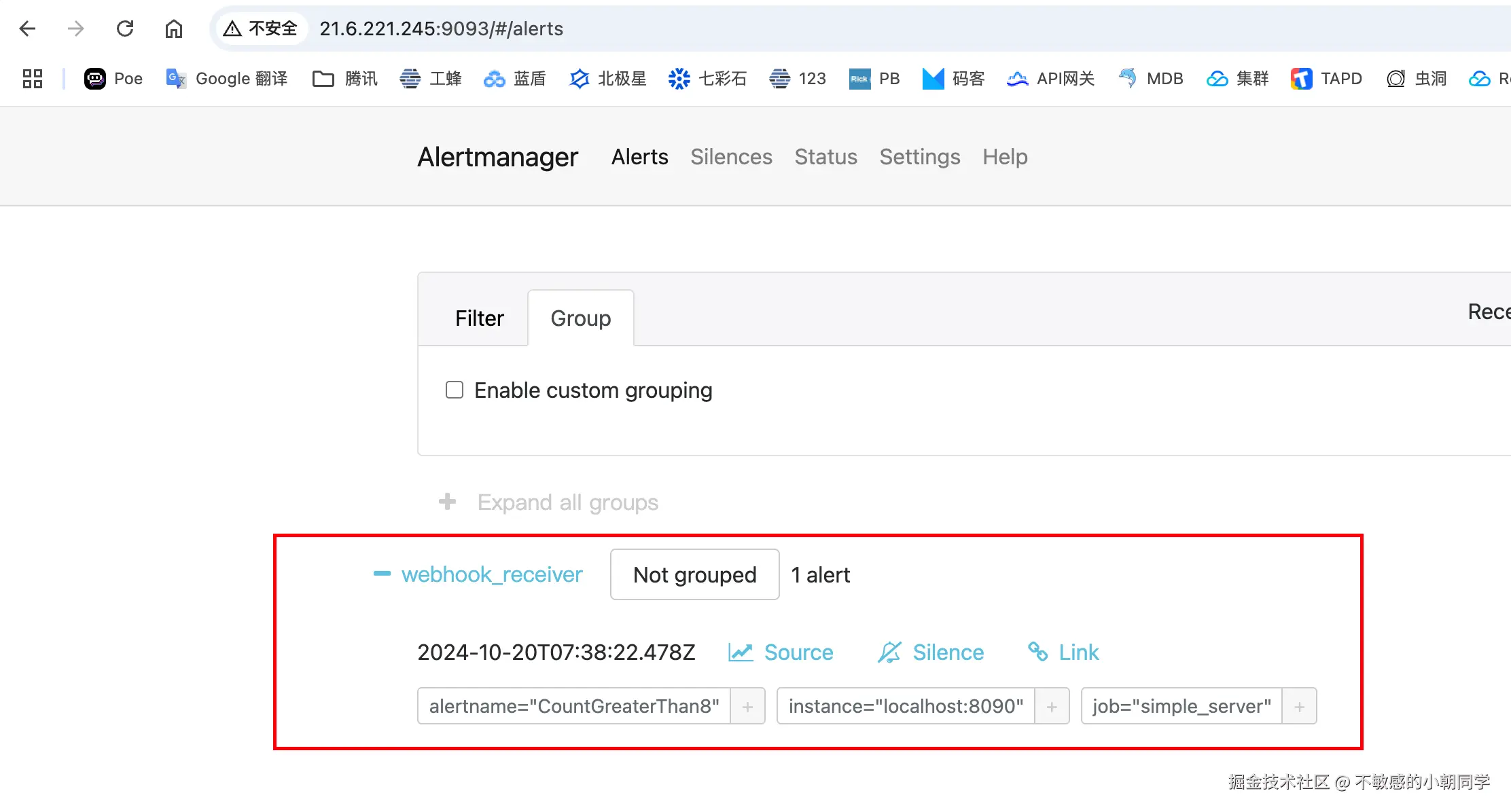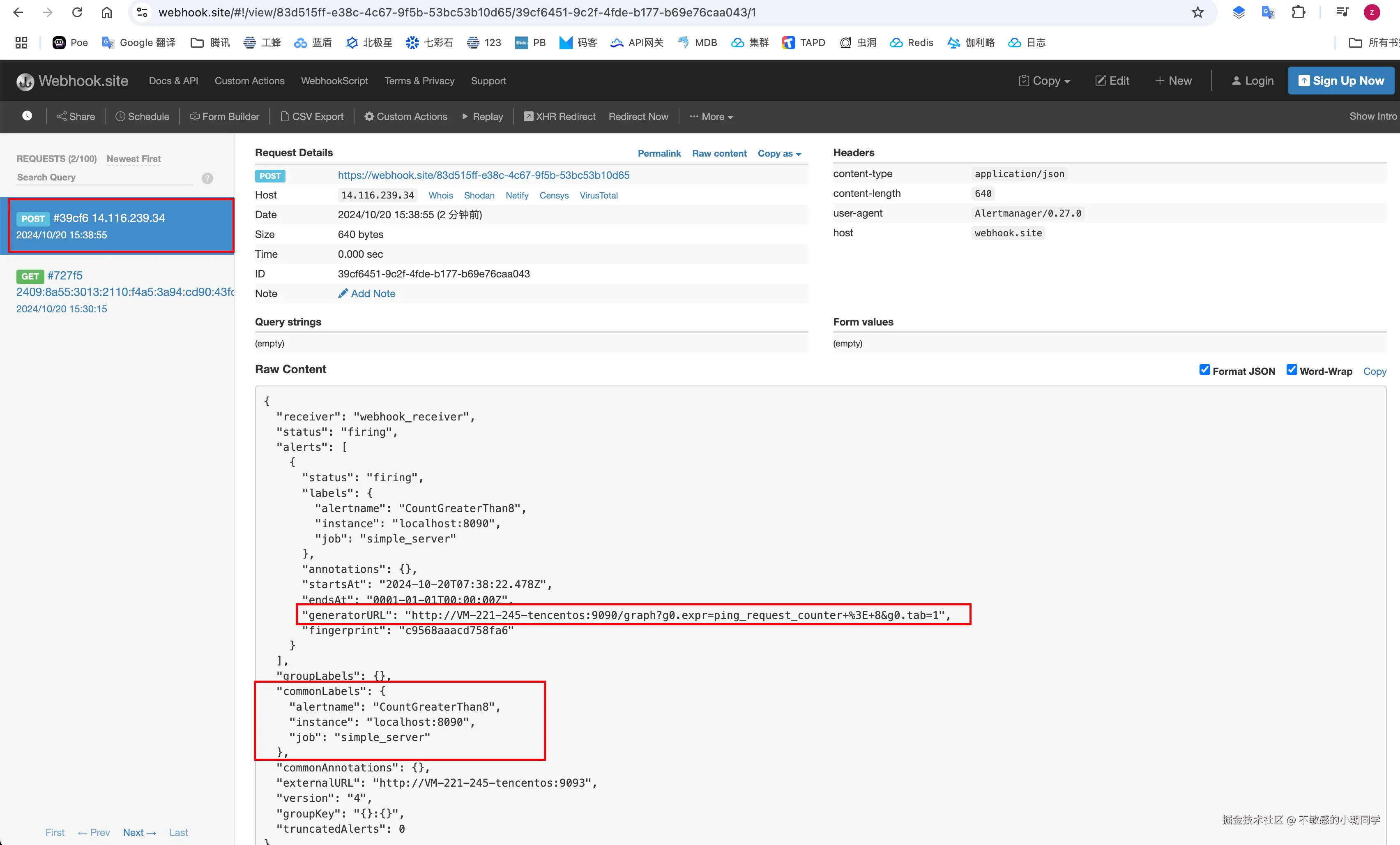 查看配置的 web-hook 报警页面,可看到也收到了相关的报警信息