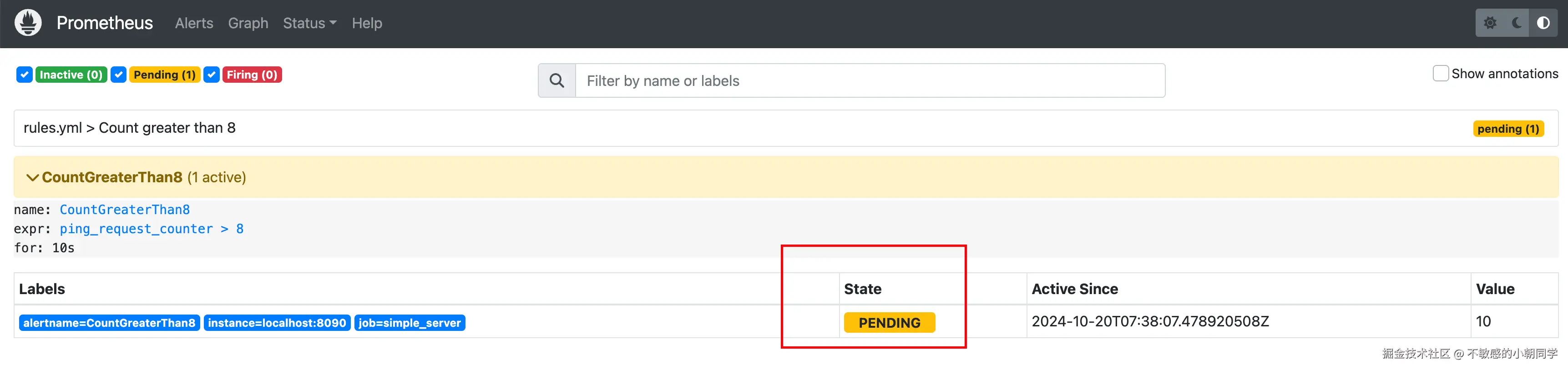 尝试触发报警,不断尝试访问 /ping 接口,查看报警页面已经是 pending 状态