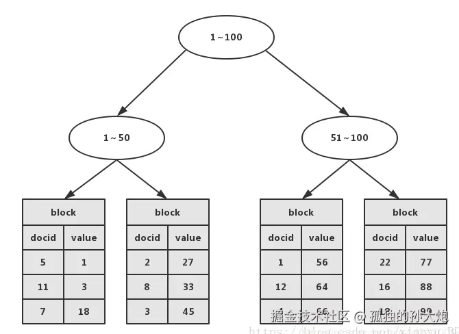 数值类型在5.0之前使用字符串存储, 5.0及之后版本使用bkdtree存储。 Bkdtree 是kdbtree的一种实现, 他是kdtree和b+树的混合实现。 我们常用的就是一维的kdtree, 会退化成B+树。 b+树的特点是非叶子节点不存值, 每个非叶子节点存储多个值,在es中每个叶子节点存储一个块数据, 每块有多个doc。 可以理解为非叶子节点存储一个范围, 他的子节点存储子范围,比如根节点是1-100, 左节点是1-50,右节点是51-100。我们常规的数值类型范围查询, 会将查询条件拆分成多个子范围,然后使用子范围查询。 所以一般建议范围值不要过大, 否则会出现大量的pointRangeQuery。 当kd tree的维度为多维时,会按维度切分数据。主要是均衡差值。从根节点开始,按维度依次排序每一层。一维的退化为二叉搜索树。 核心思想是查找与当前节点最近的节点, 按不同维度切分区域, 查询时跳过区域外的数据遍历。 可以简单理解为,查找上海坐标附近的城市,北京离上海很远,而且北京离天津很近,所以天津离上海也很远,天津就不用查找。